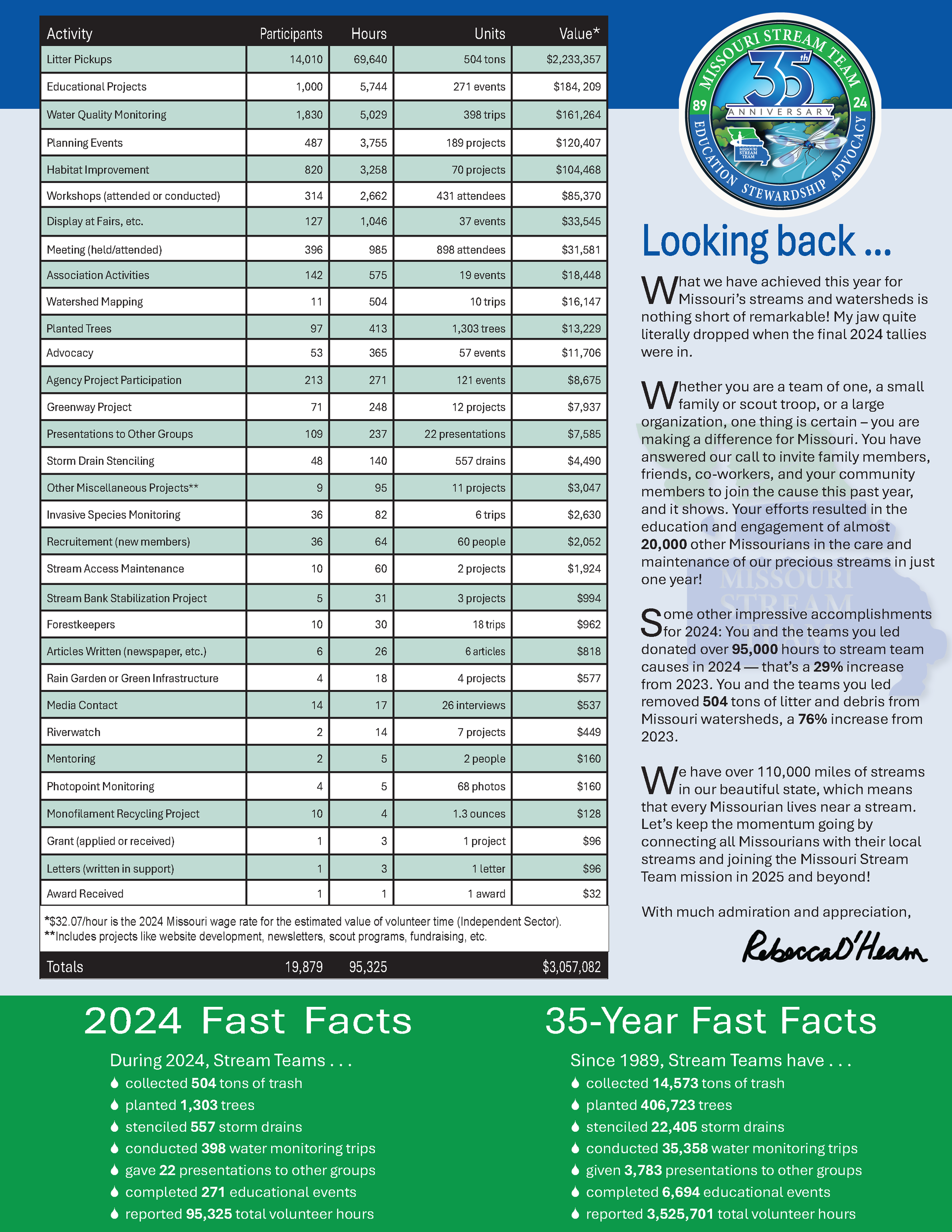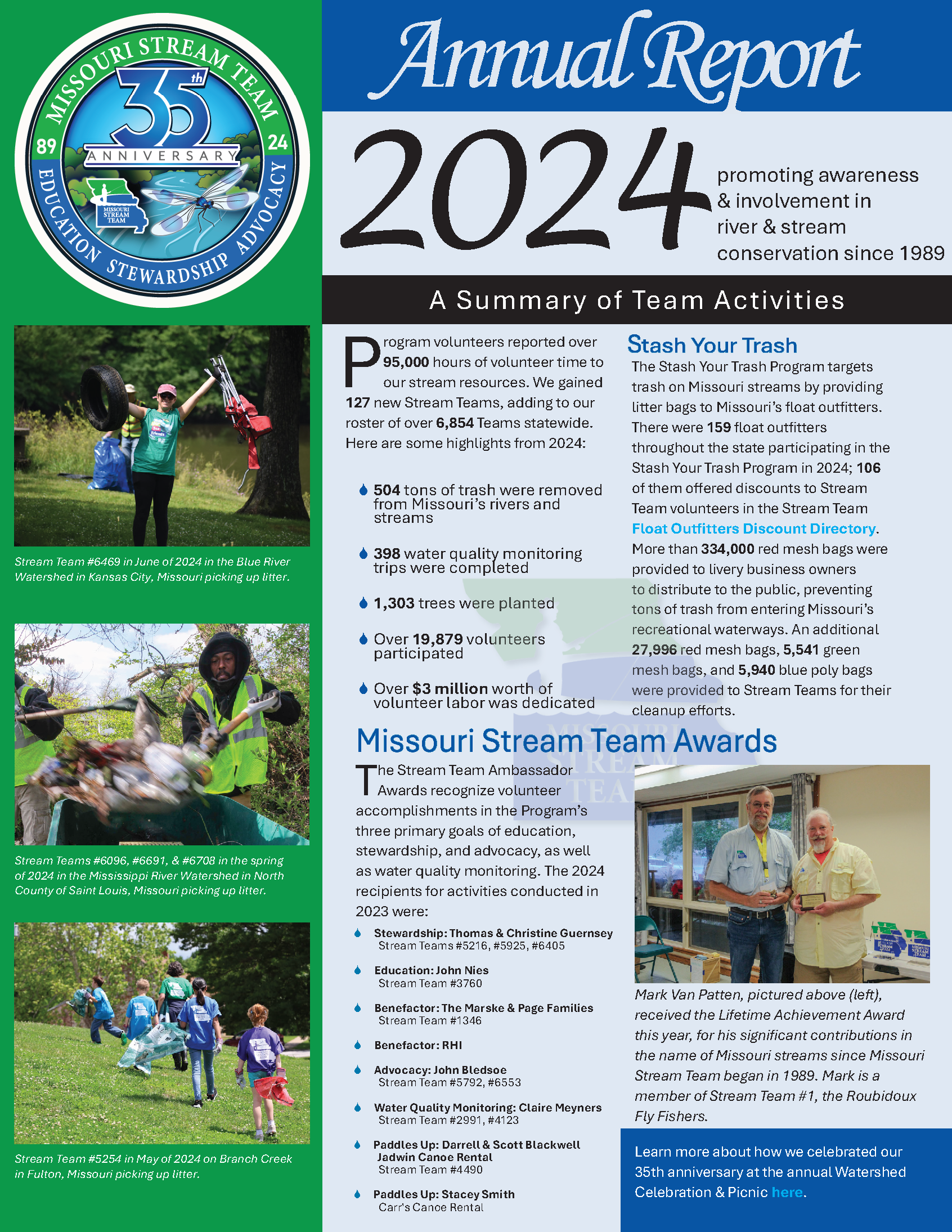Downloadable Annual Report PDFs (For prior editions of the Stream Team Annual Report, please contact the Stream Team Staff at streamteam@mdc.mo.gov.)